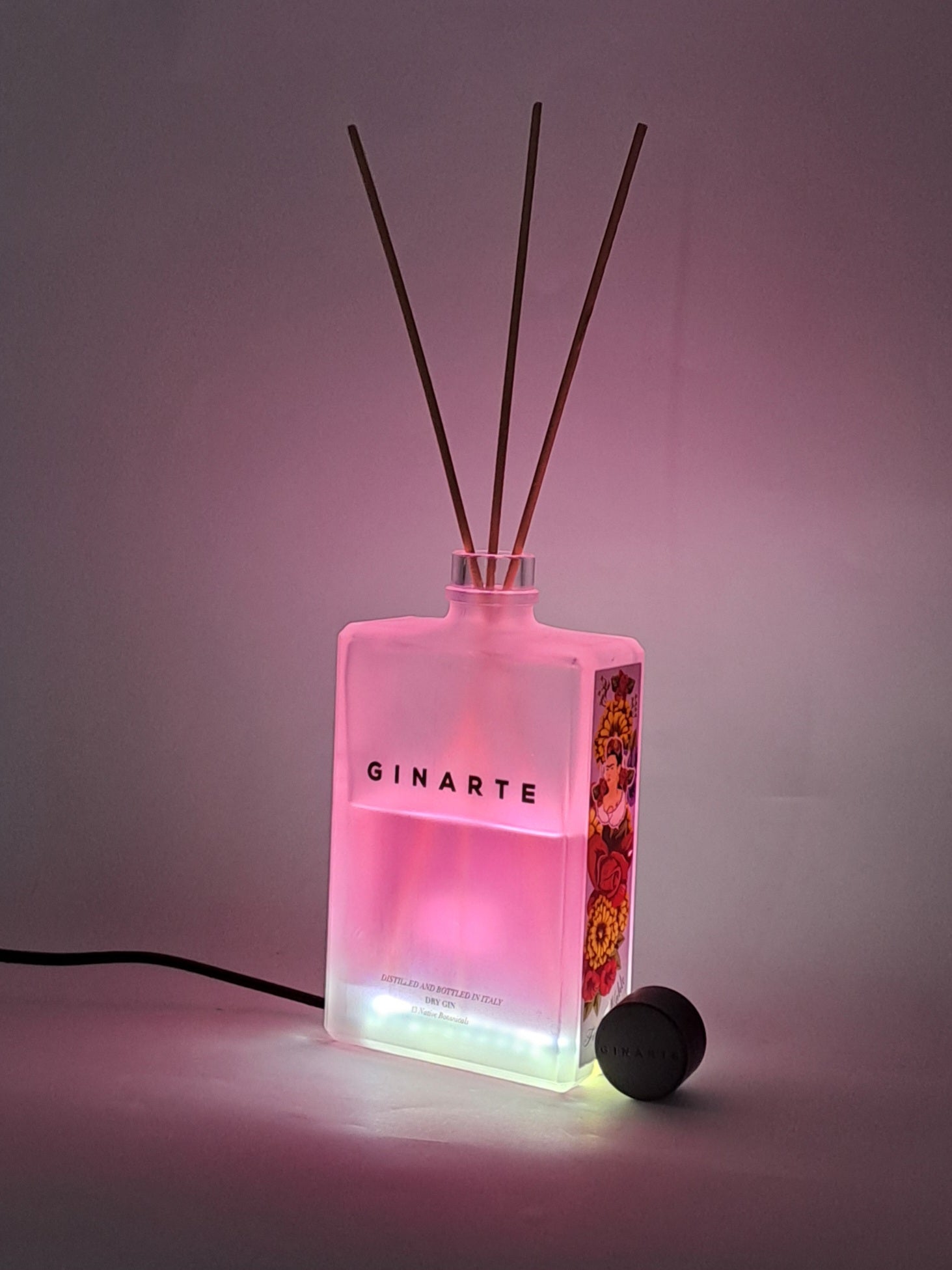 La Lampada Gin Arte con diffusore di profumo è un oggetto decorativo e multifunzionale dal design unico. La bottiglia è dotata di un LED integrato nella base di vetro, che illumina il diffusore senza entrare in contatto con il liquido. La luce cambia colore in base alla tonalità del profumo inserito, creando un effetto visivo suggestivo e personalizzabile.