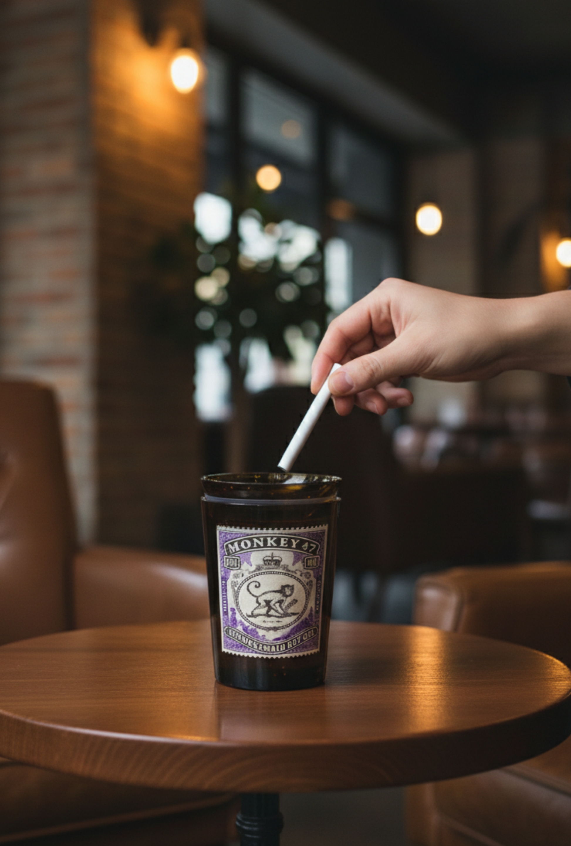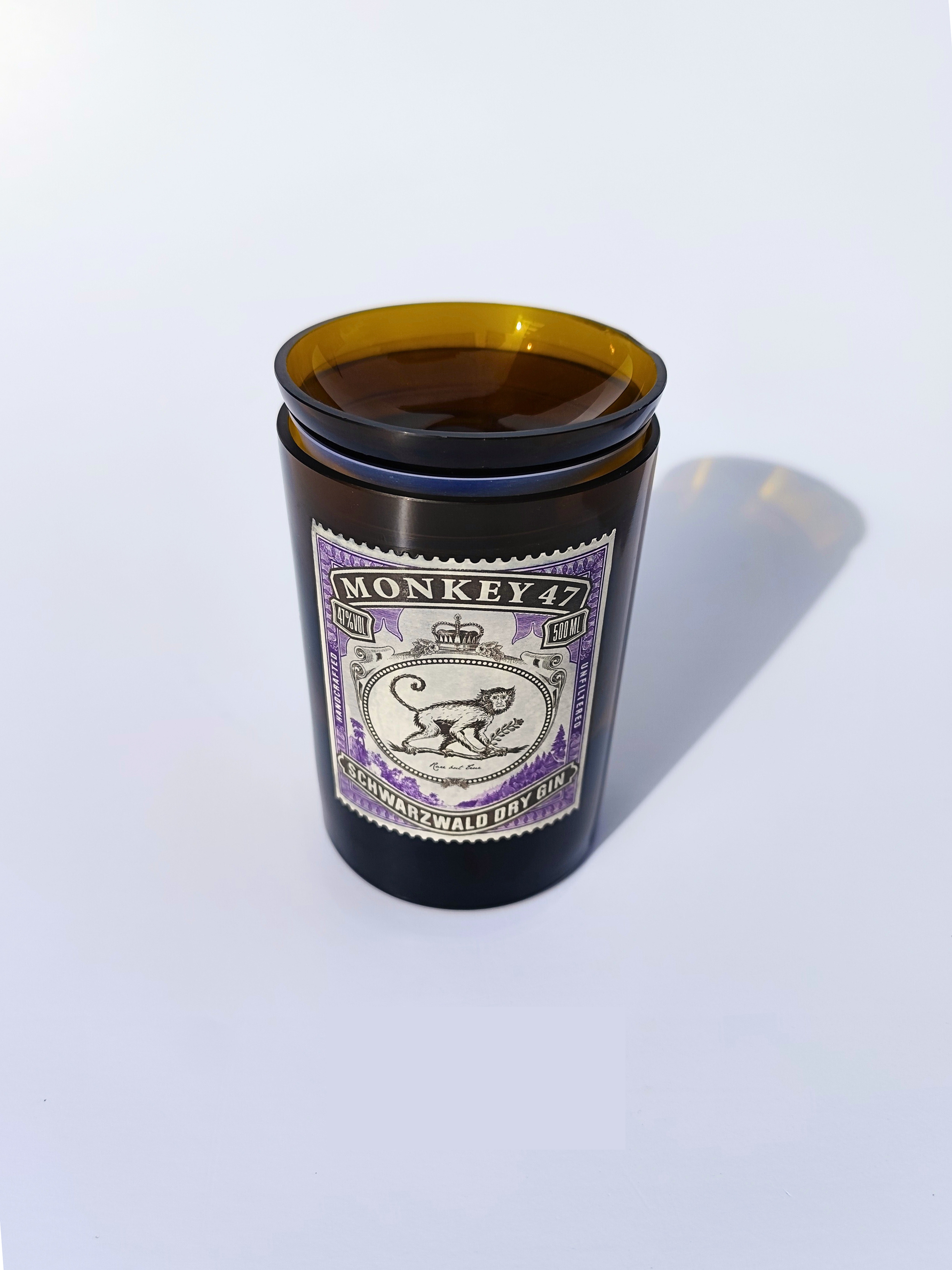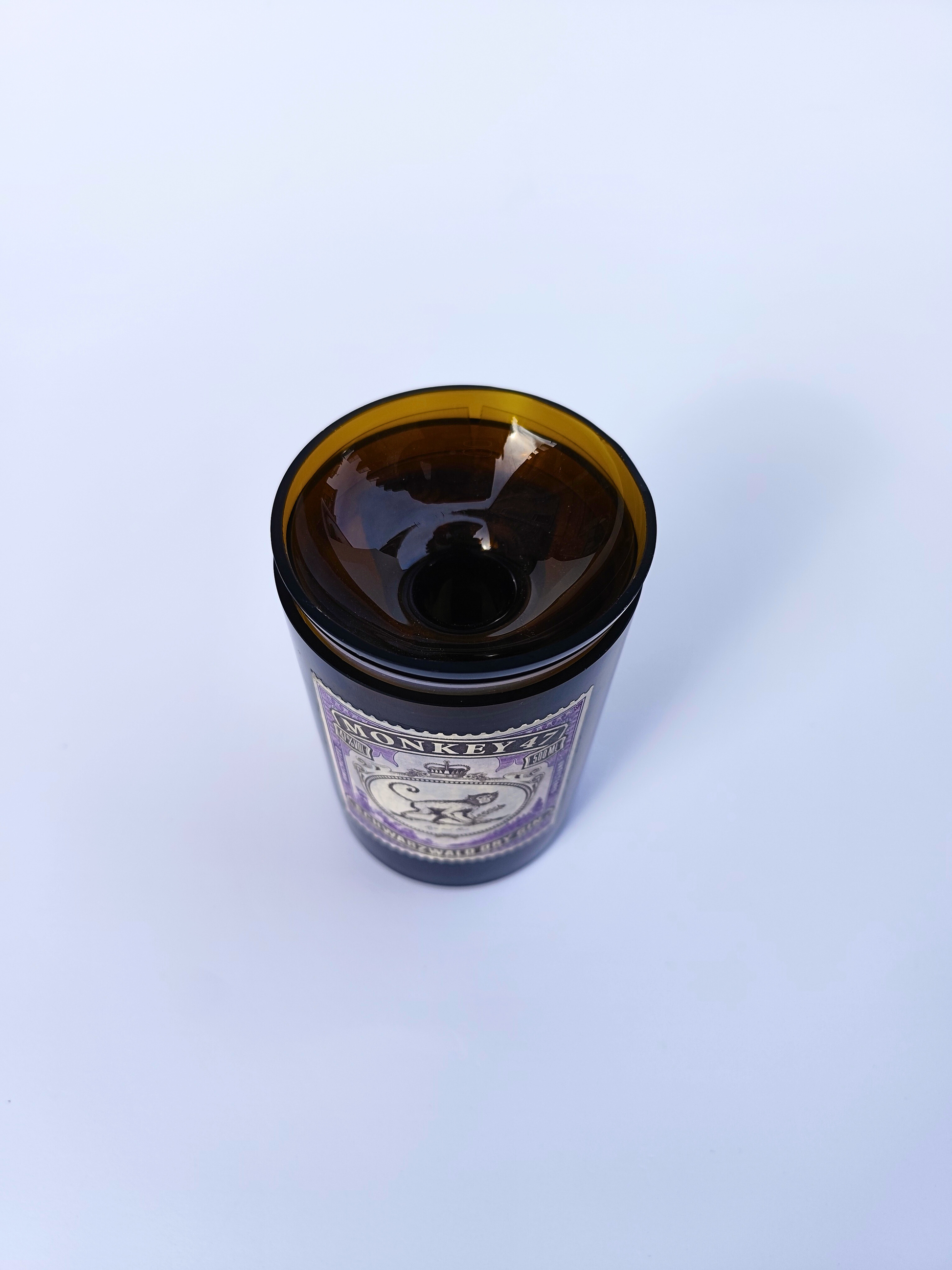 Posacenere/posastick ottenuto da una bottiglia di Monkey 47. Rifinito a mano, con coperchio realizzato dal collo originale. Un oggetto di design sostenibile e unico, perfetto per aggiungere carattere a qualsiasi ambiente e tenere pulita la tua zona living o il tuo locale.