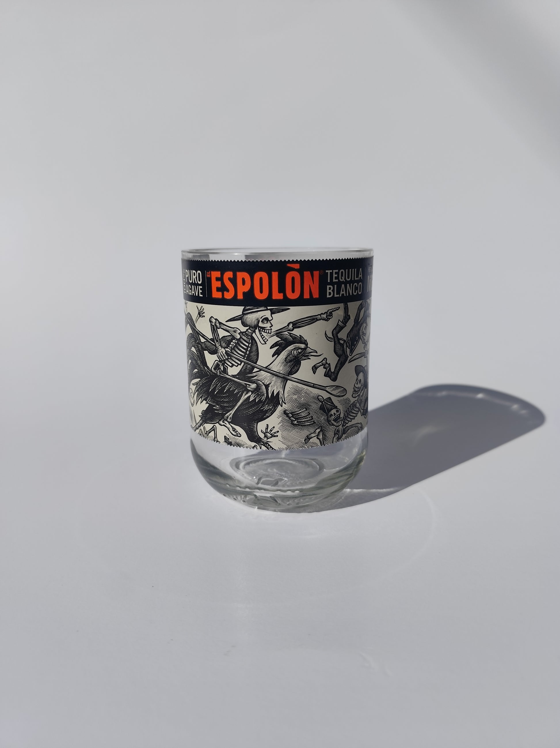 Design esclusivo e sostenibile: realizzato con vetro riciclato e rifinito con dettagli unici, il set richiama le opere dell'artista José Guadalupe Posada, creatore dell'etichetta di Espolòn.