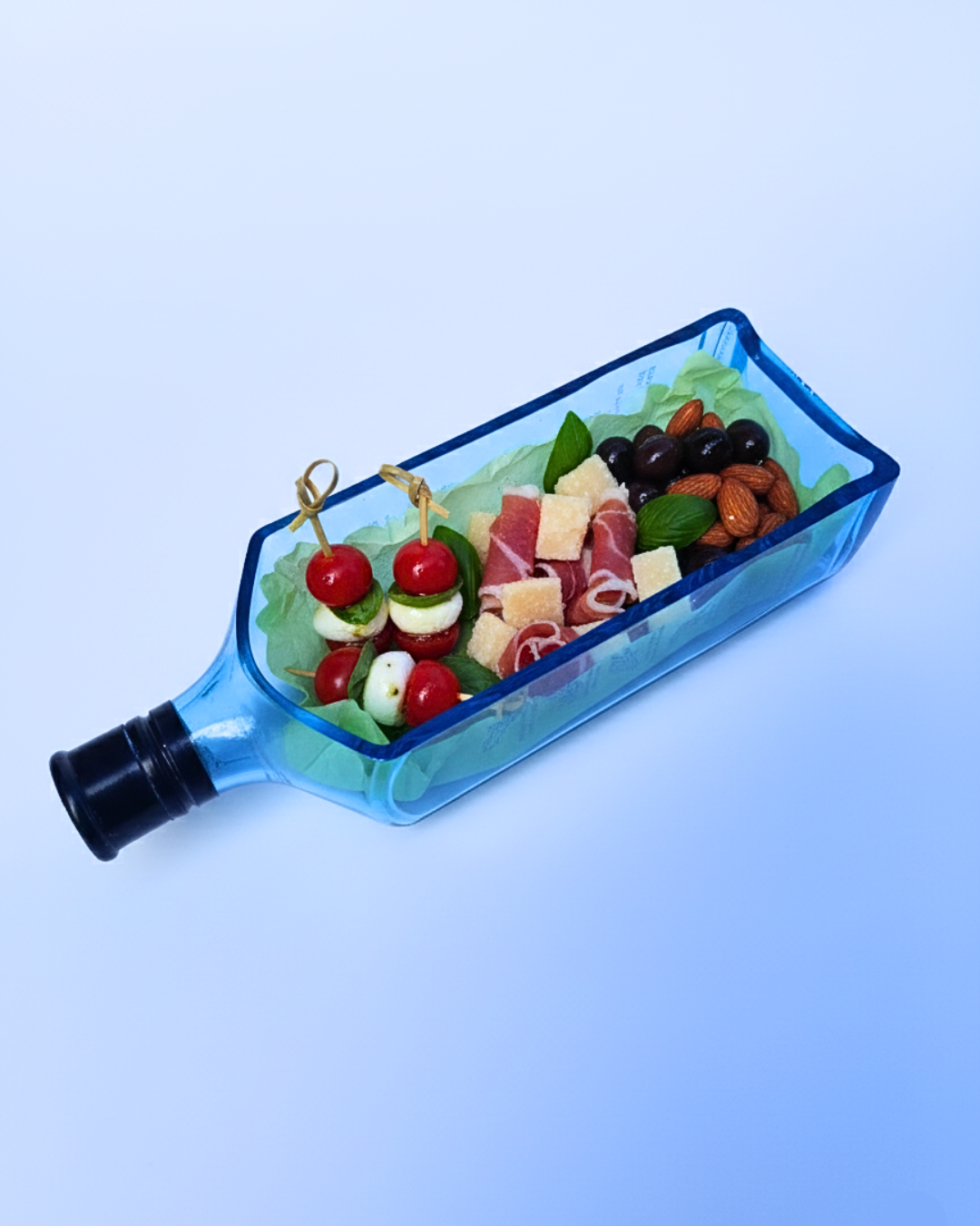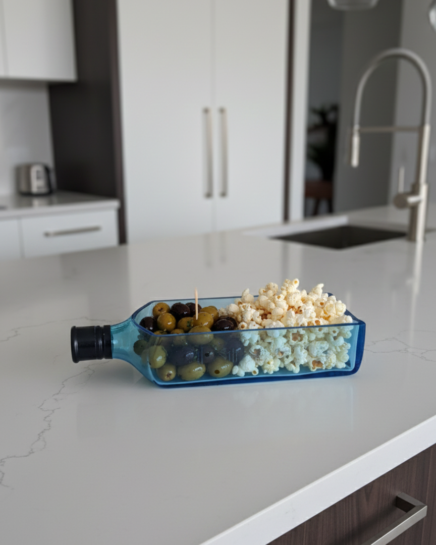 Design elegante e creativo: la bottiglia è stata accuratamente tagliata e levigata, creando un vassoio ideale per contenere Stuzzichini vari per il tuo aperitivo o altri piccoli oggetti.
