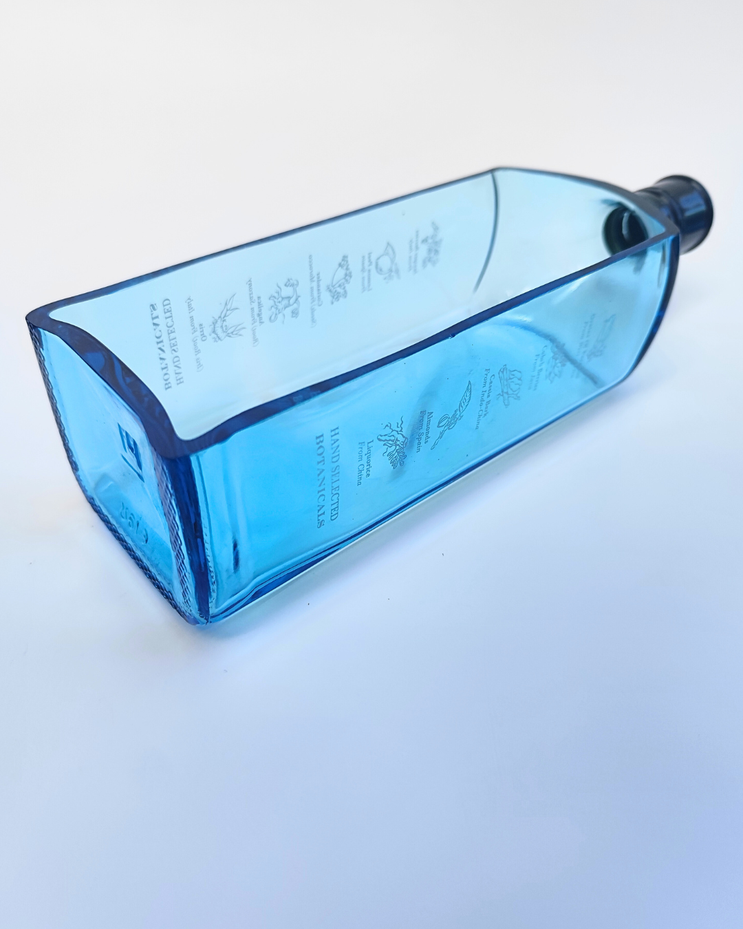 Vassoio Bombay Un tocco di originalità e stile per i tuoi ambienti, il Vassoio Bombay è un complemento d'arredo realizzato a partire da una bottiglia di Gin Bombay Sapphire riciclata e trasformata in un esclusivo vassoio adatto per i tuoi stuzzichini o come pratico portaoggetti.
