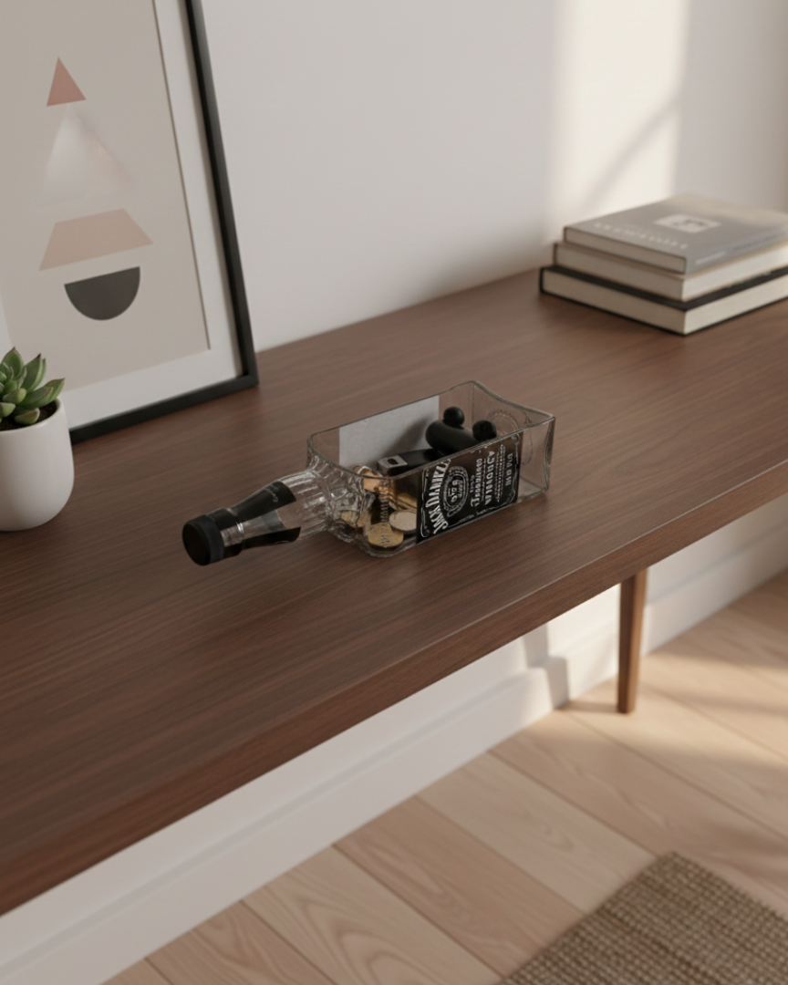 Un tocco di originalità e stile per i tuoi ambienti, il Vassoio Jack Daniel's è un complemento d'arredo realizzato a partire da una bottiglia di Whisky Jack Daniel's riciclata e trasformata in un esclusivo vassoio adatto per i tuoi stuzzichini o come pratico portaoggetti.